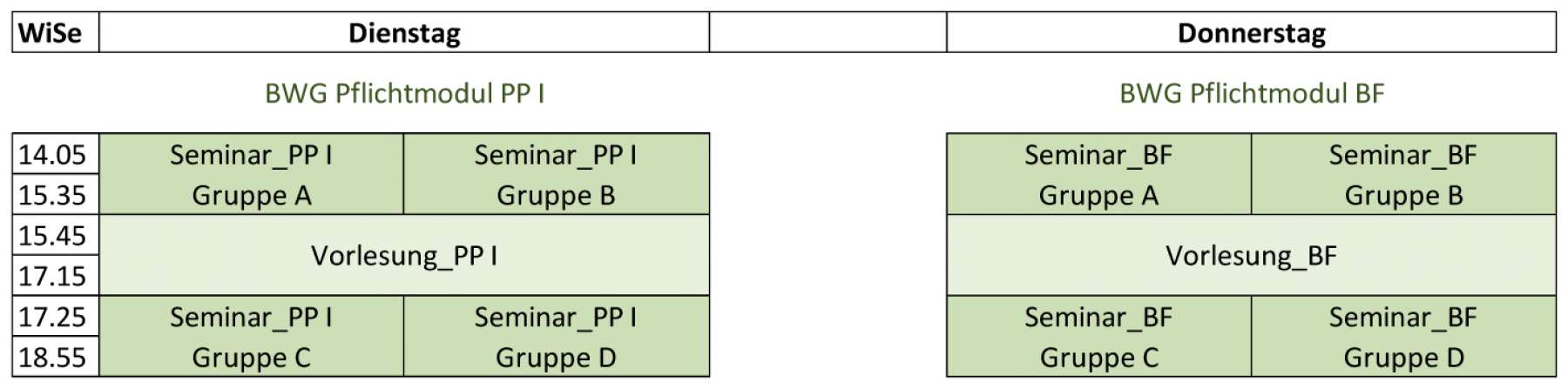 Im Wintersemester findet das Modul Pädagogische Professionalisierung I (PP I) immer am Dienstag, das Modul Bildungswissenschaftliche Forschung (BF) immer am Donnerstag statt. Die Module bestehen aus je einem Seminar und der Vorlesung. In zwei Zeitschienen werden – eine entsprechende Zahl von Teilnehmer*innen vorausgesetzt – die Seminare in je zwei Parallelgruppen angeboten. Dazwischen findet die Vorlesung statt.