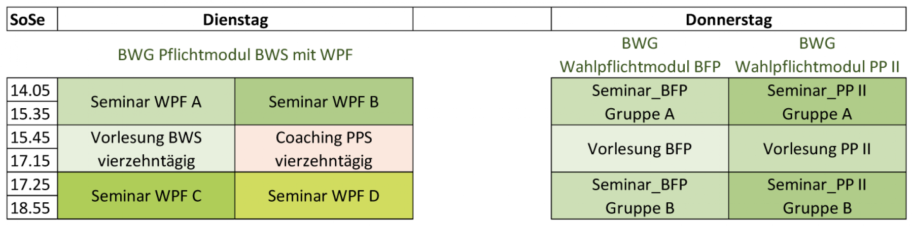 Im Sommersemester findet das Modul Bildungswissenschaftliche Schwerpunktsetzungen (BWS) immer am Dienstag statt. Für den Besuch dieses Moduls gibt es keine Voraussetzung. Im Bereich der Seminare kann aus thematisch verschiedenen Wahlpflichtfächern (WPF), die in zwei verschiedenen Zeitschienen angeboten werden, gewählt werden. Die Vorlesung, die im Gegensatz zu allen anderen Vorlesungen nur einstündig ist, findet im wöchentlichen Wechsel mit dem Coaching für die Pädagogisch-Praktischen Studien (PPS) statt.