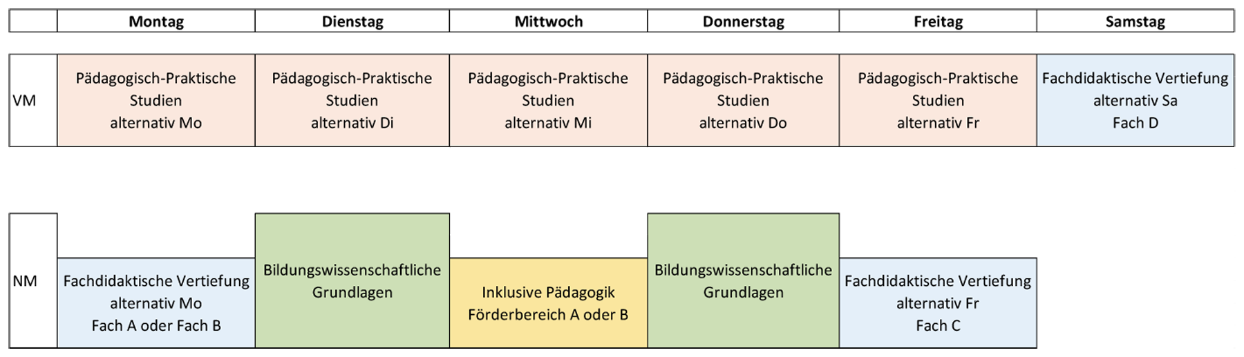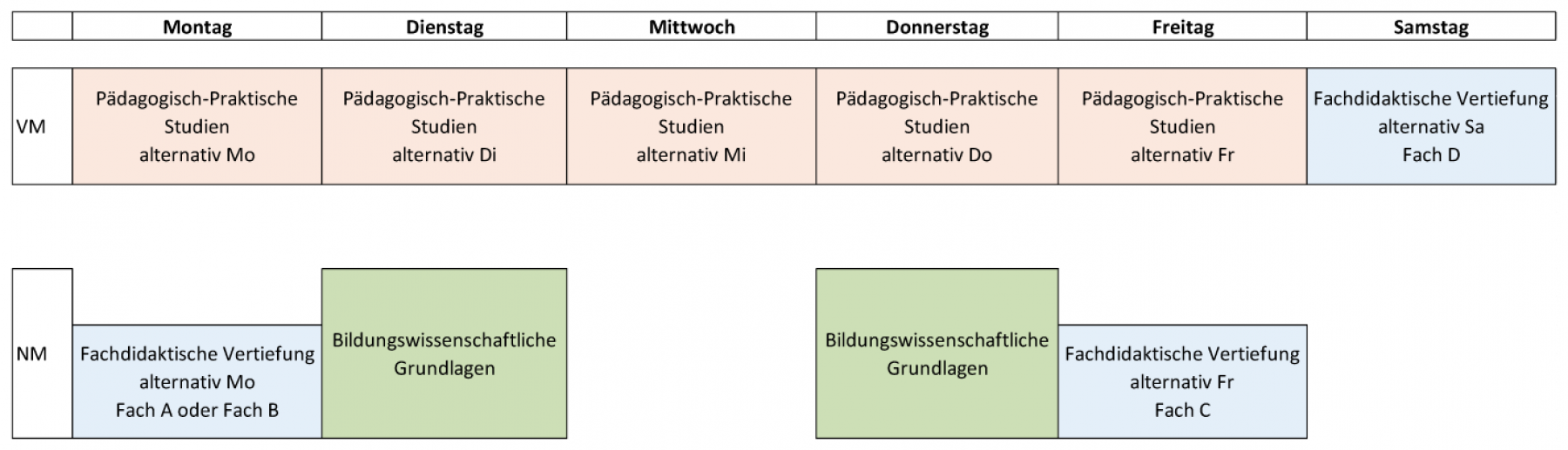 Die Module im Bereich der Bildungswissenschaften finden am Dienstag und Donnerstag jeweils nachmittags statt. Im Rahmen der Fachlichen und fachdidaktischen Vertiefung kann ein Fach gewählt werden. Je nach Wahl finden die Veranstaltungen am Montagnachmittag, Freitagnachmittag oder Samstagvormittag statt.